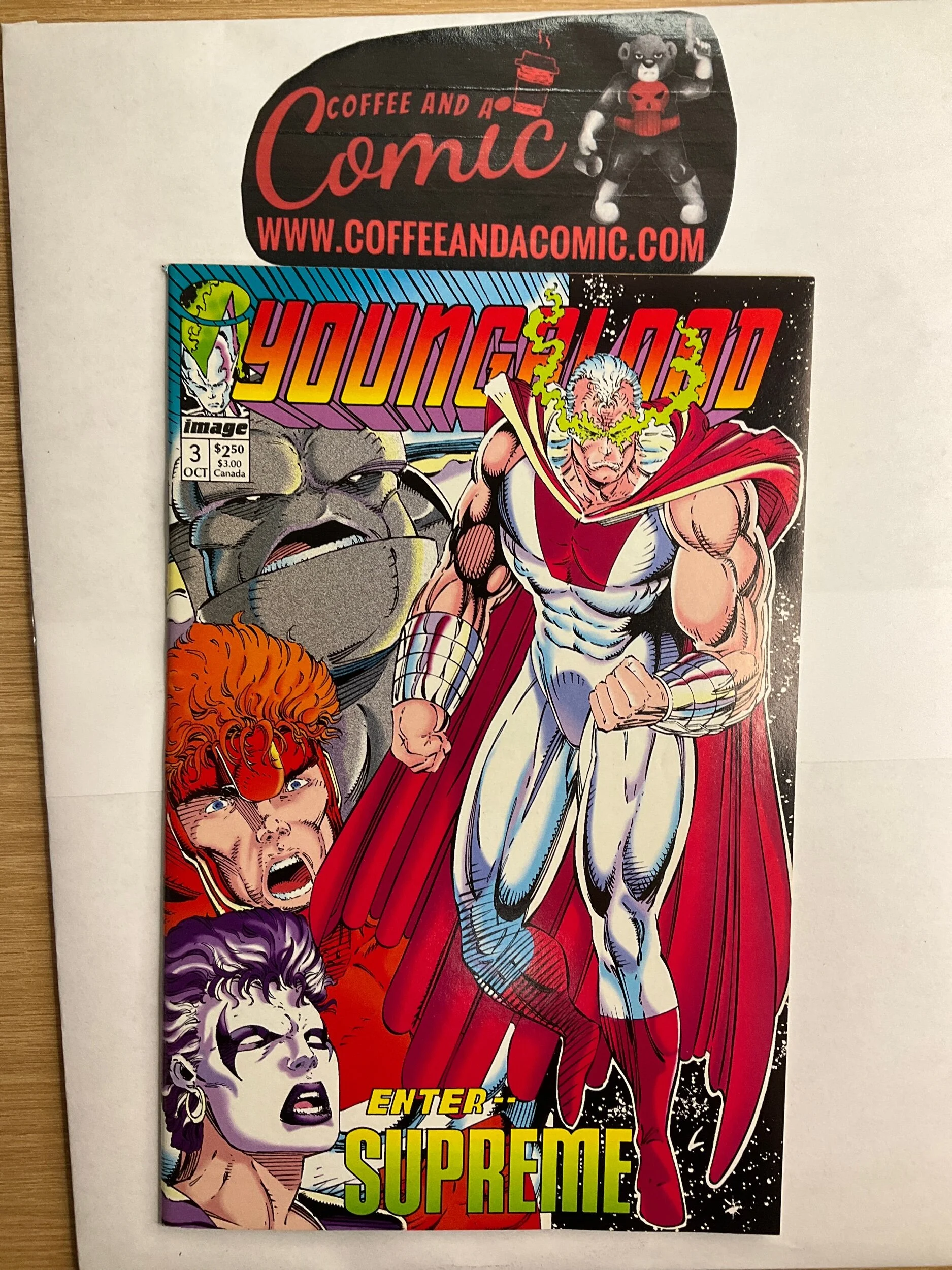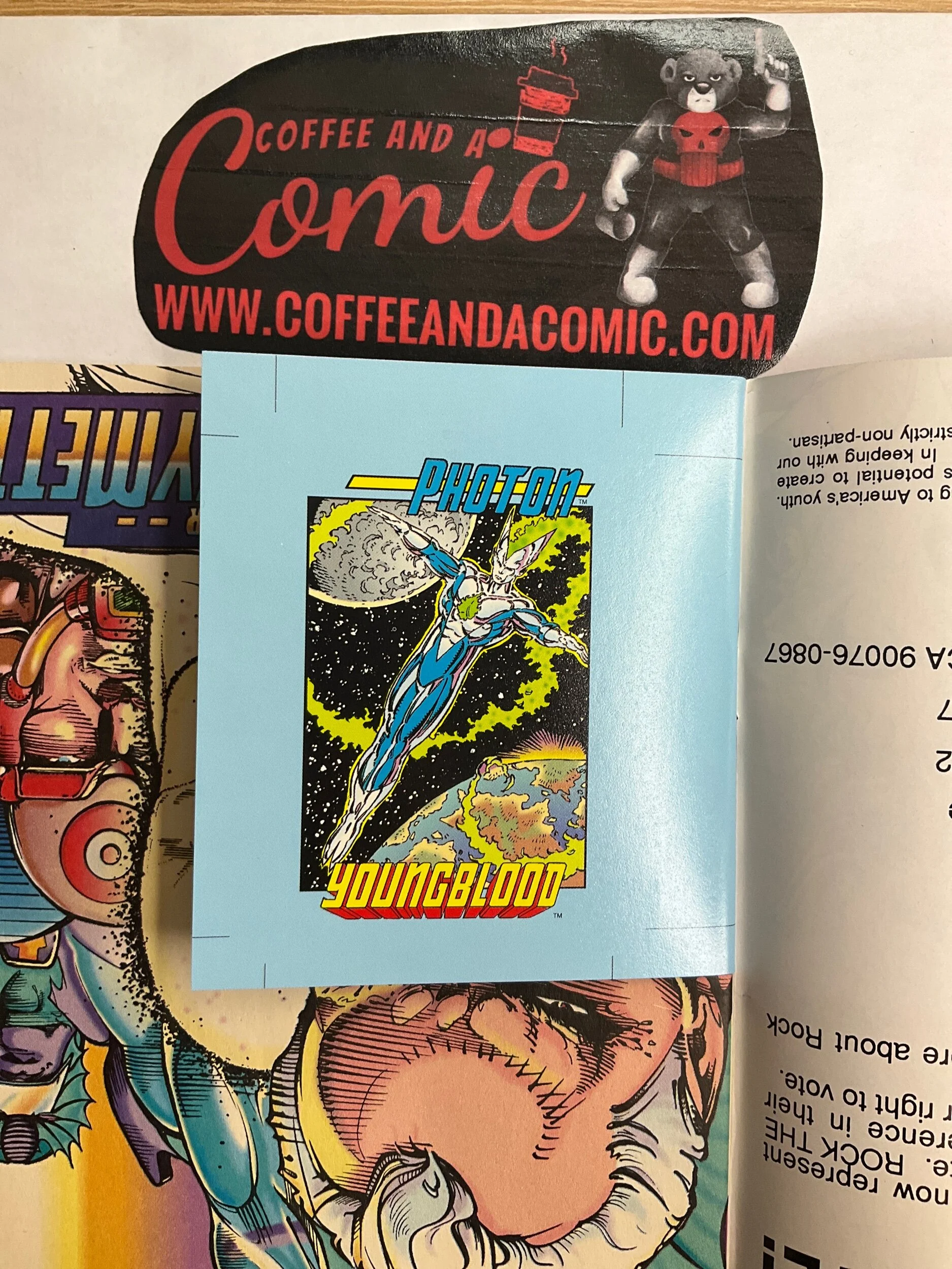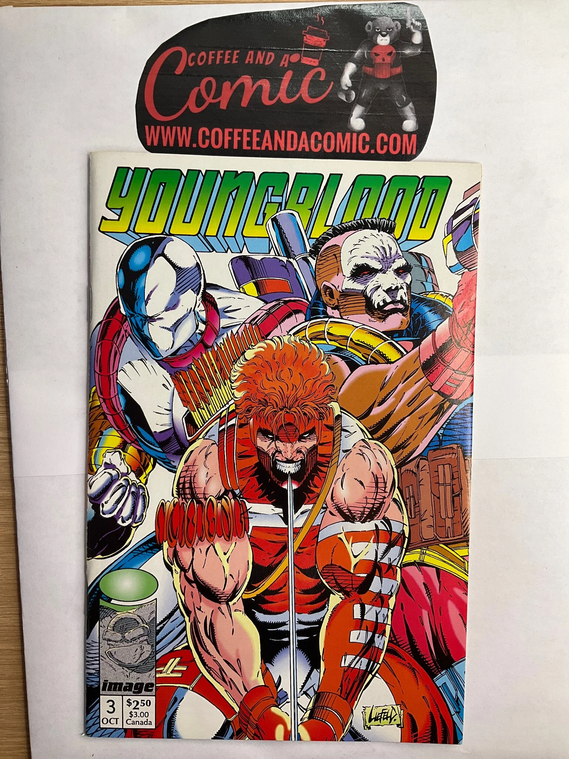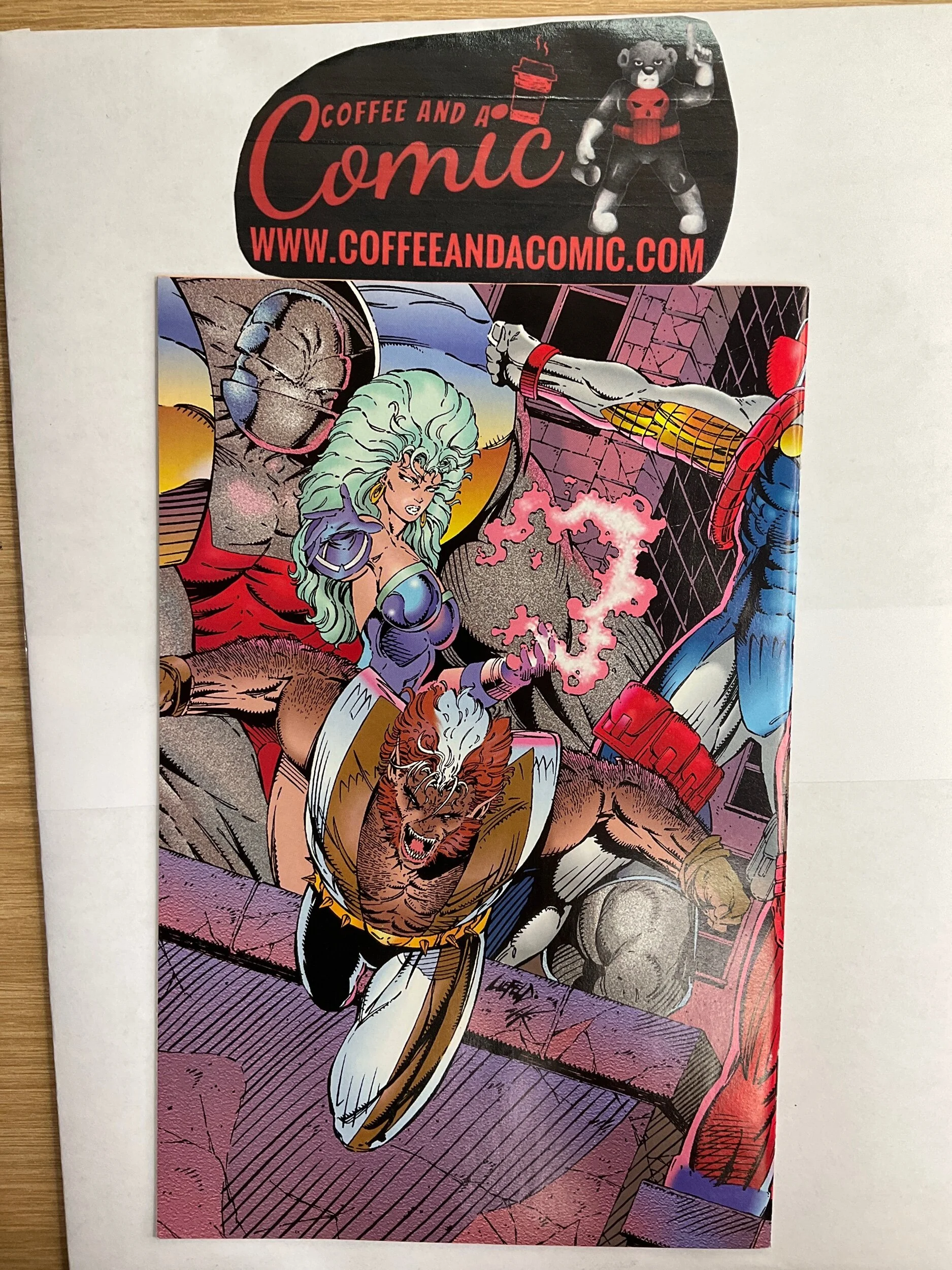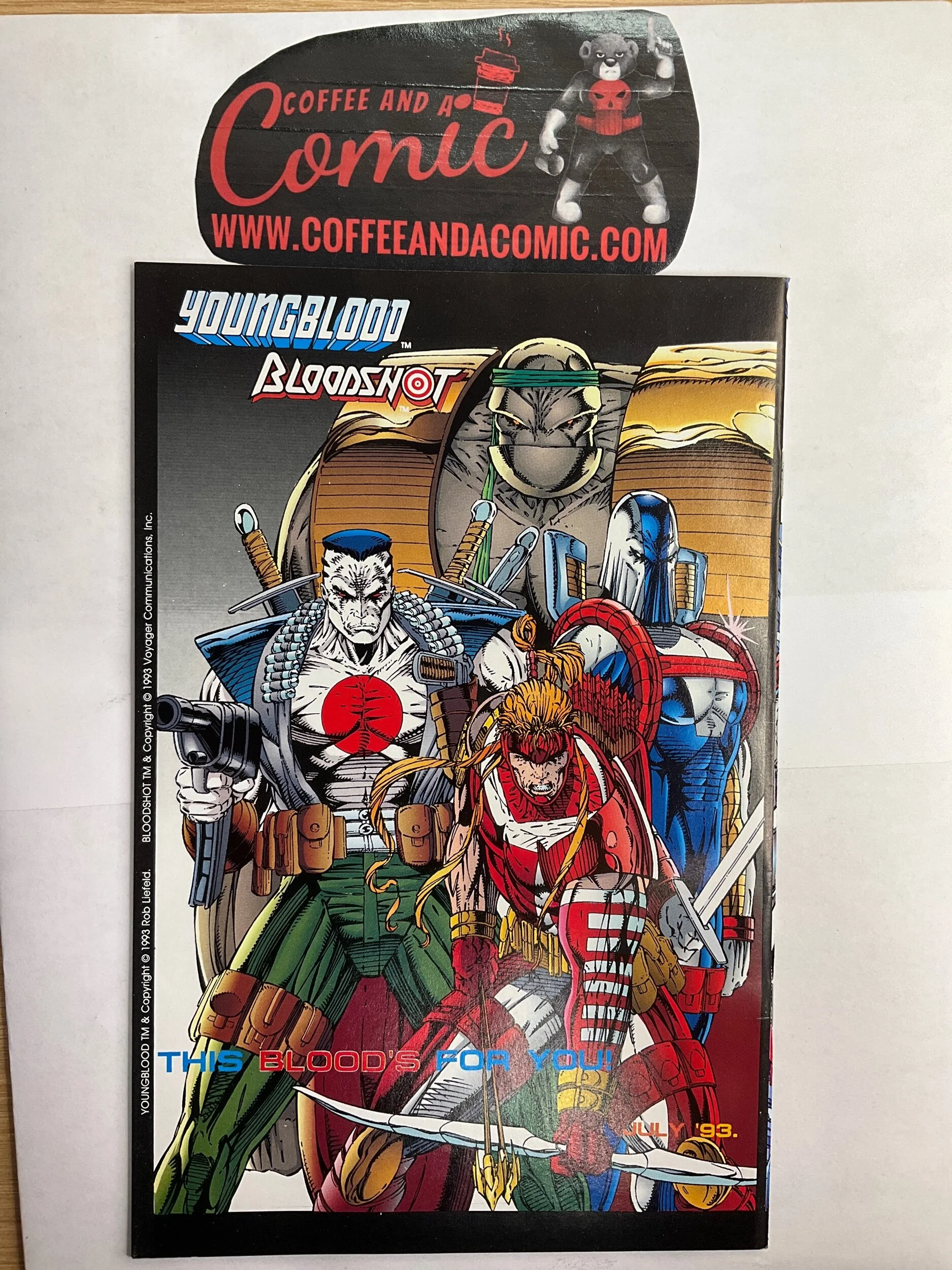 Guest-starring Prophet Story and art by Rob Liefeld. The rebel faction known as the Berserkers make a daring escape from the Death Squad, but who is the ominous Darkthorn. Meanwhile, Youngblood team members Sentinel, Brahma, Riptide, Cougar, and Combat awaken a super-soldier who has been in cryogenic sleep since the days of WWII. When John Prophet awakens disorientated and in a world he does not r