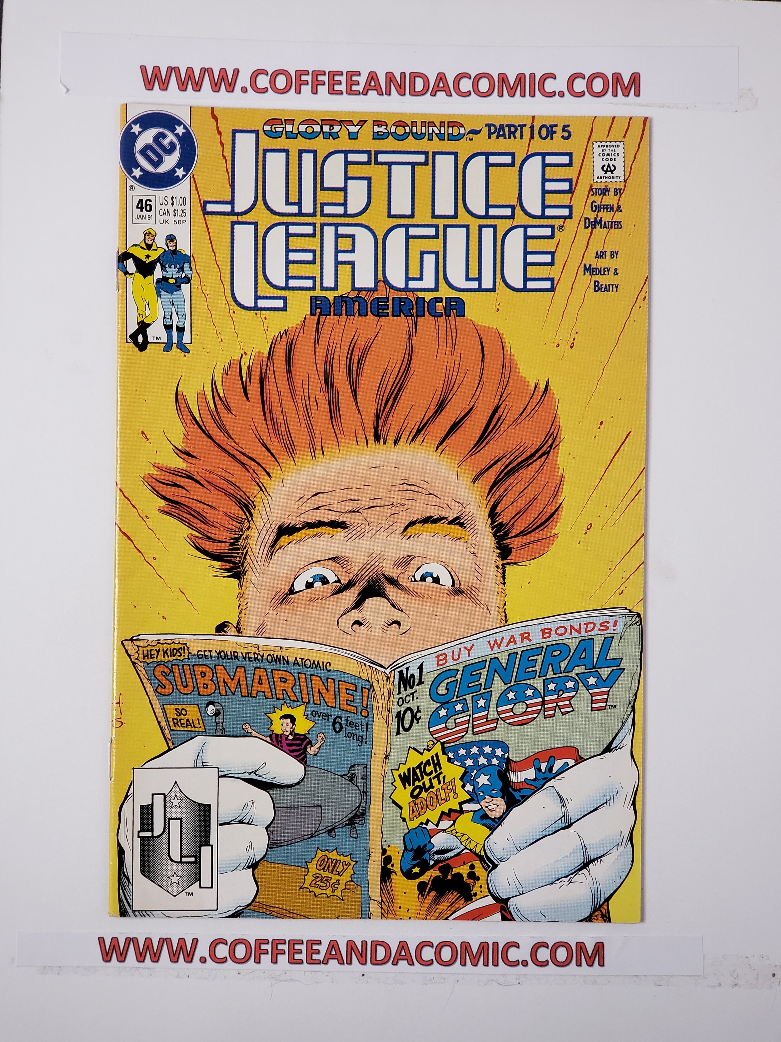 Justice League America, Vol. 1, Issue 46, 1989-1996, DC Comics -More info: It's Guy Gardner vs. Joe Jones in a bidding war to obtain a rare copy of General Glory #1 in "Old Glory". Part 1 of 5, continued next issue. Plot and breakdowns by Keith Giffen, script by J.M. DeMatteis, pencils by Linda Medley, inks by Jose Marzan. Adam Hughes/Karl Story cover. Cover price $1.00.