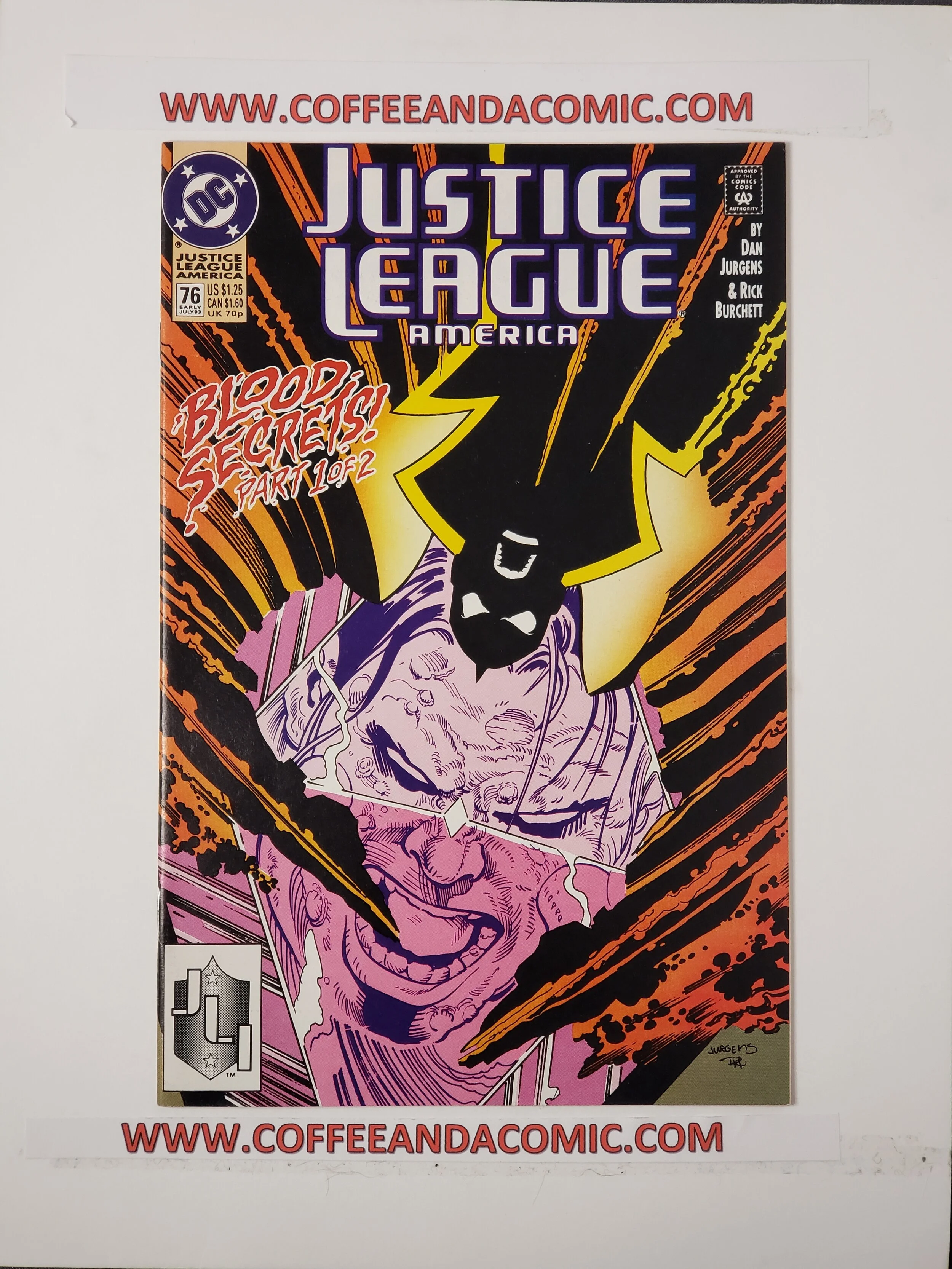 Justice League America, Vol. 1, Issue 76, 1989-1996, DC Comics -More info: Blood Secrets, Part 1 of 2. At last...the true face of Bloodwynd is revealed! Now, the JLA travels to unknown ends of the Earth in order to discover the truth behind this astonishing secret. Continues next issue. Written by Dan Jurgens, with art and cover by Jurgens and Rick Burchett. Cover price $1.25.